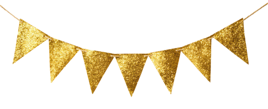 Golden glitter bunting banner with seven triangular flags for celebration isolated on transparent background