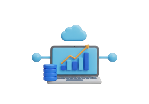 A Dynamic 3D Data Analytics Visualization with a Laptop, Cloud, and Rising Bar Graph on a Transparent Canvas, Ideal for Business and Technology Presentations