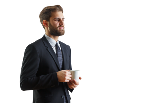 Portrait of a man in a business suit holding a coffee mug, isolated on a white background, symbolizing relaxation, professionalism, or office work