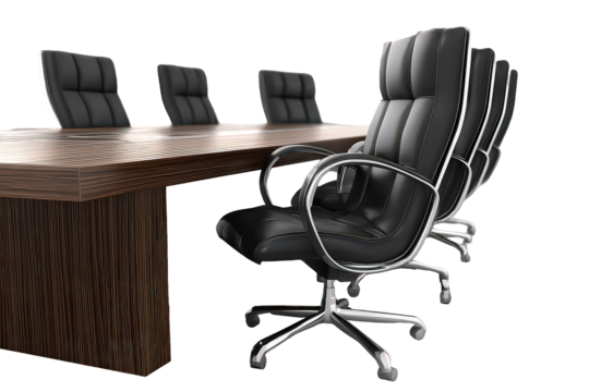 Modern Conference Room with Long Wooden Table and Black Leather Chairs