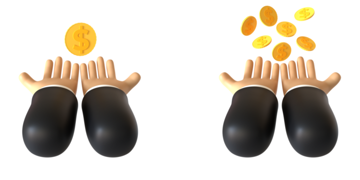 3D render of a hand gesture receiving a coin. Object on a transparent background