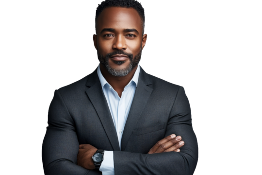 Confident Smiling Businessman in Black Suit with Glasses Standing with Arms Crossed Against transparent background – Professional Corporate Portrait for Business and Marketing Materials