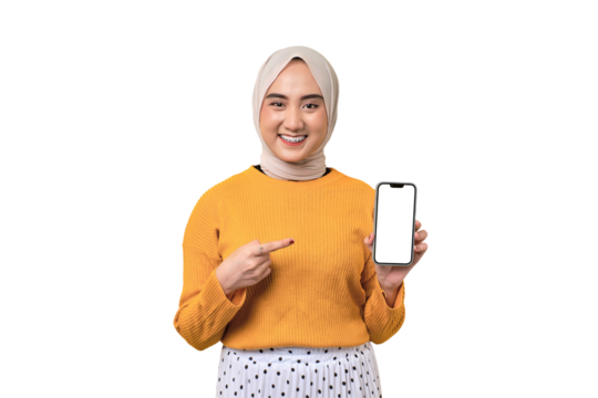 Beautiful smiling Asian girl wearing hijab pointing index finger at mobile phone with blank white screen isolated on transparent background, mockup, copy space