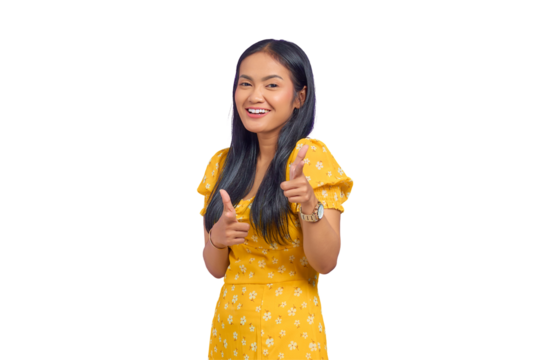 Portrait of smiling young Asian woman pointing fingers at copy space with victory gesture isolated on transparent background