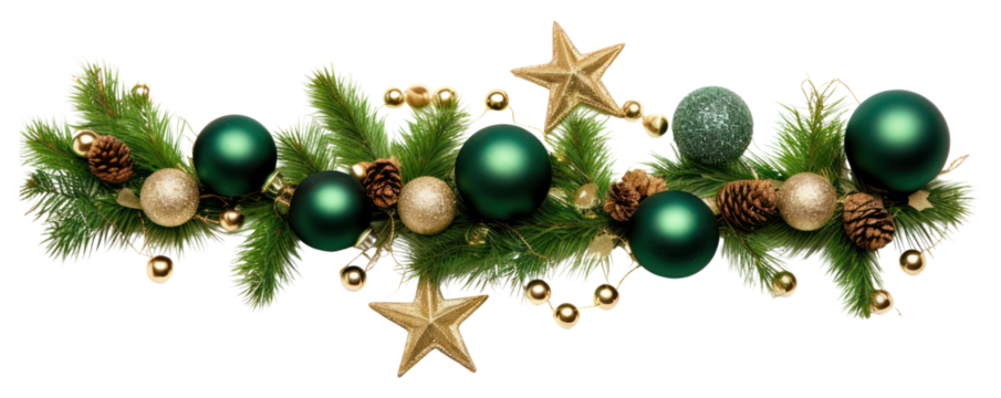Flat lay of Christmas ornaments, pine cones, and festive decorations arranged on a white background.  PNG transparent.