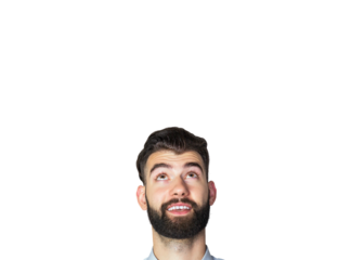 A bearded man in a collared shirt smiling and looking upwards, isolated on a white background. Concept of curiosity, thinking, or inspiration