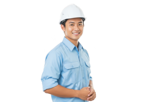 Smiling construction worker wearing safety gear, isolated on transparent background