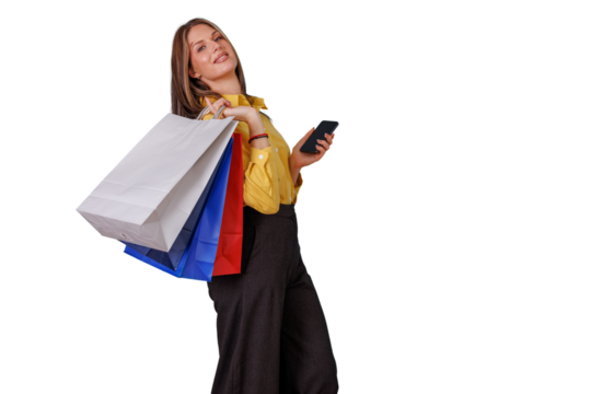 Young woman smiling, holding shopping bags and using smartphone for online shopping or mobile banking on transparent background
