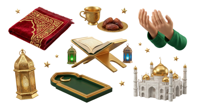 hands folded in prayer surrounded by religious symbols and artifacts isolated transparent background