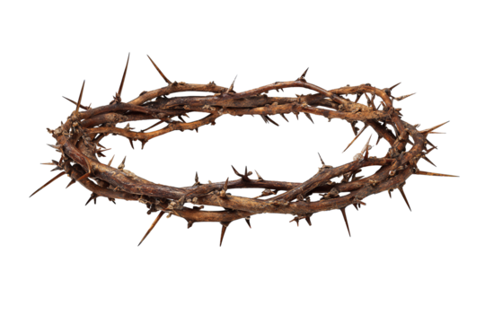 Tight oval crown of thorns made from intertwined stems with dark bark and sharp spikes, viewed slightly from above, detailed texture, isolated on transparent background.
