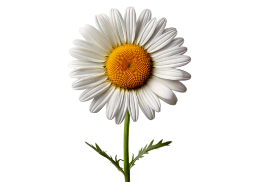 Pristine common daisy flower with white petals and vibrant yellow center, slender green stem angled upwards, isolated on a transparent background with copy space, natural purity and fresh beauty