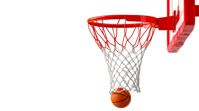 Basketball going through a red hoop with white net on black background on transparent background