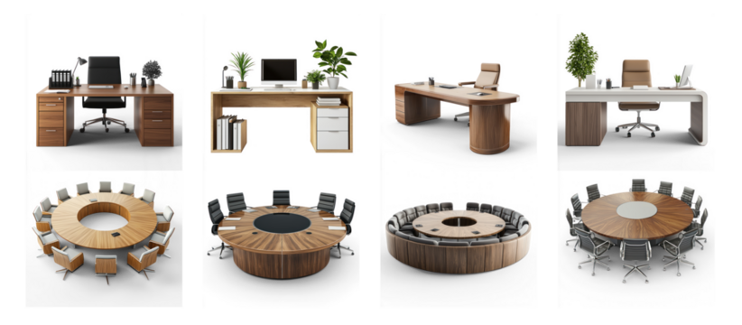 Collection of Modern office desk and Round conference table isolated on transparent background