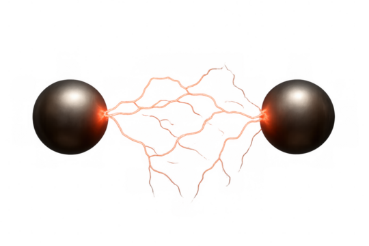 Electrical discharge sparking between two metallic spheres, creating an energy connection concept with transparent background