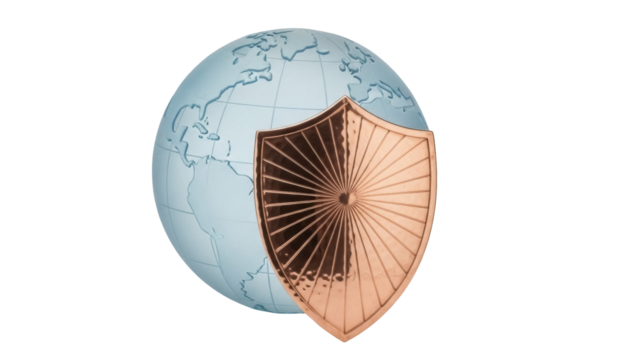 Globe with shield isolated PNG on transparent background, global security and protection concept for digital safety and data privacy