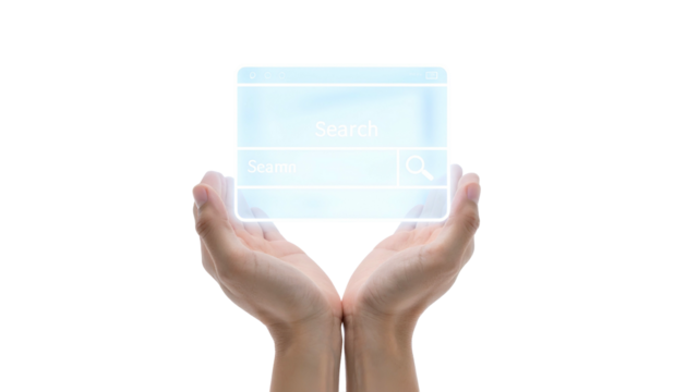 Hands cupping a glowing, transparent search bar overlay against a black background