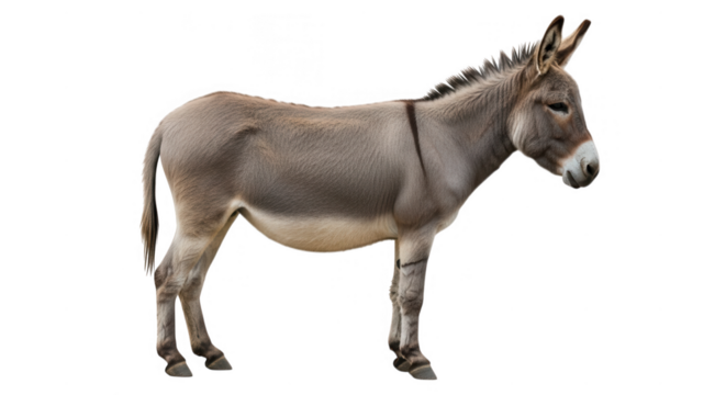 Cute domestic donkey standing with long ears and calm expression isolated PNG with Transparent Background