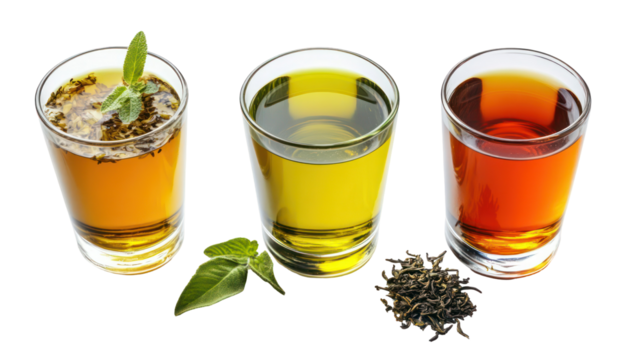Japanese wellness drinks with green tea brown rice tea and herbal infusions on transparent background