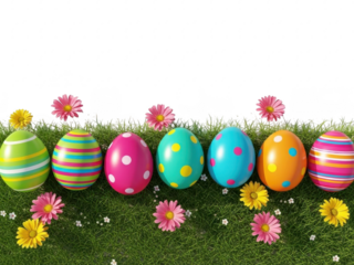 Colorful easter eggs on green grass with flowers isolated on transparent background
