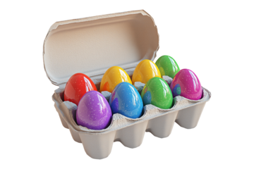 Carton holding colorful eggs in shades of purple, blue, yellow, green, red, and cyan, isolated on white transparent background, symbolizing Easter