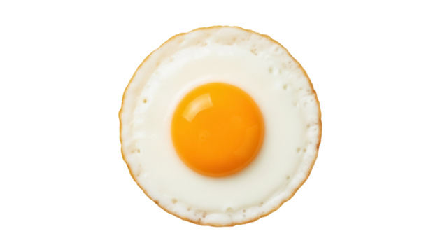 Fried egg isolated PNG on transparent background, sunny-side up breakfast food with golden yolk and cooked egg white for culinary design