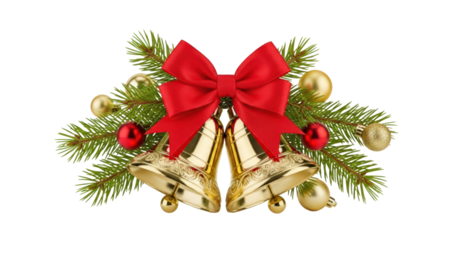 Transparent background two golden christmas bells with red bow on fir branch isolated on transparent background