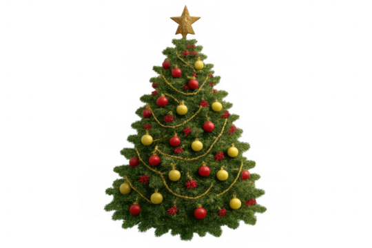 Festive christmas tree with golden star topping, decorated with red and yellow baubles and garlands, transparent background