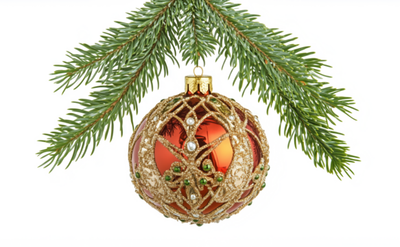 a beautifully decorated christmas bauble hanging on a fir branch over transparent background