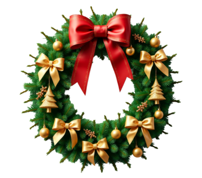 Christmas wreath decorating door with festive lights and golden stars on a transparent background