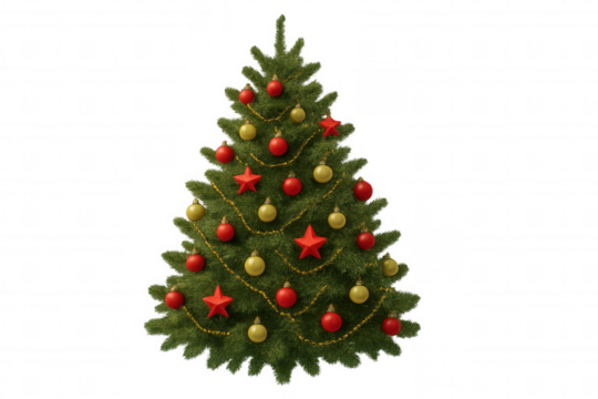 Christmas tree decorated with red and golden baubles, stars, and garland, bringing holiday cheer. Transparent background
