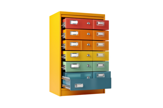 Grey metallic filing cabinet with open drawer and files on transparent background