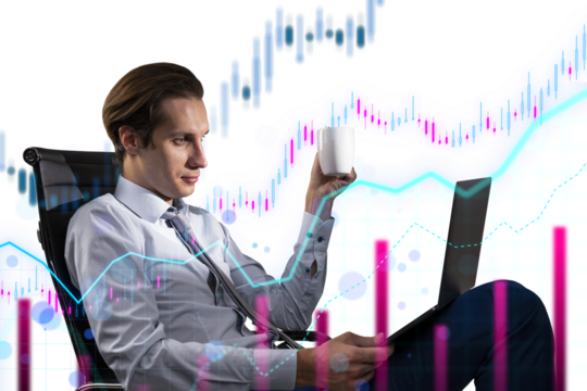 A businessman using a laptop with overlaid financial graphs and data, symbolizing market analysis on a white background with light hue