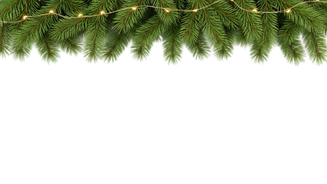 Seamless decorative Christmas border with coniferous branches and glowing warm lights on transparent background ideal for festive banners, greeting cards, and holiday-themed designs.