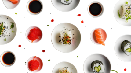 Sushi, salmon, soy sauce, and roe pattern on transparent background