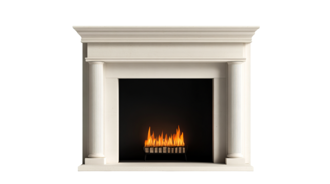 Inviting fireplace scene with dancing flames behind an ornate wrought iron screen creating a on transparent background