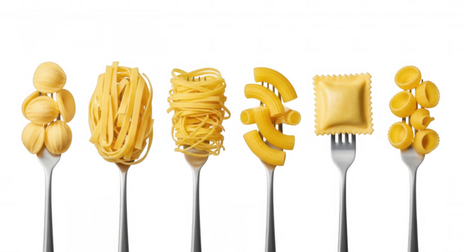 Various pasta shapes on forks isolated on a transparent background