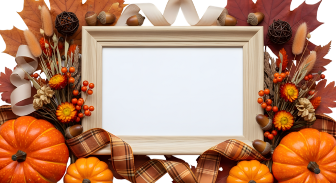 A rustic wooden frame decorated with pumpkins, autumn leaves, berries, nuts, and ribbons, perfect for fall or thanksgiving isolated on transparent background