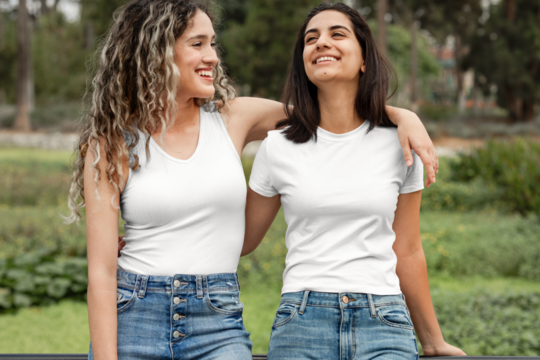 Group of friends huddling, smiling, wearing colorful shirts on transparent background