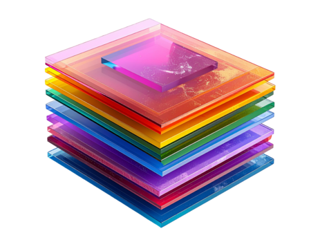 Geometric, layered abstract cube with rainbow gradient color scheme