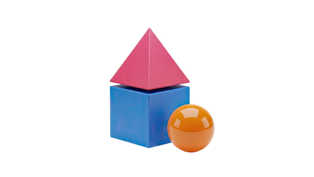 3D Geometric shapes: red pyramid, blue cube, orange sphere on transparent background