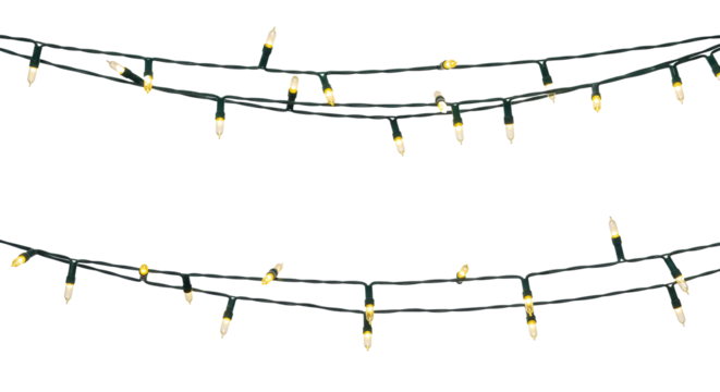 String of warm white fairy lights isolated on transparent background. String lights isolated on white background.
