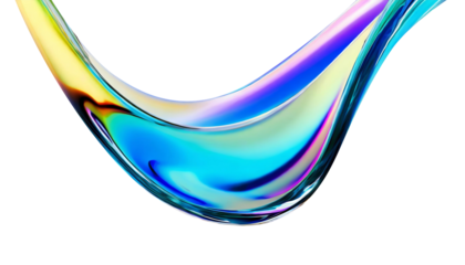 Abstract liquid glass shape with colorful reflections. Ribbon of curved water with glossy color wavy fluid motion. Chromatic dispersion flying and thin film spectral effect.