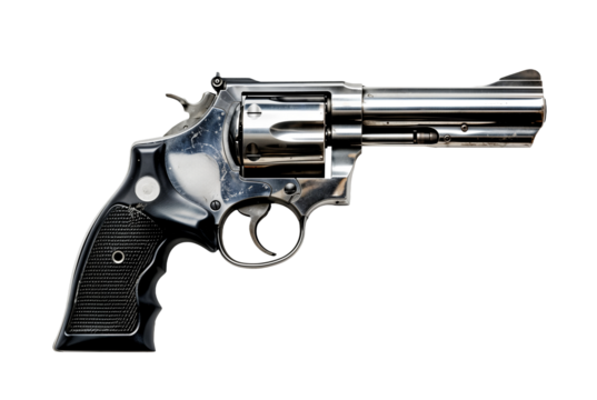 Generic black revolver gun png, isolated on white or transparent background, steel firearm, weapon pistol cut out