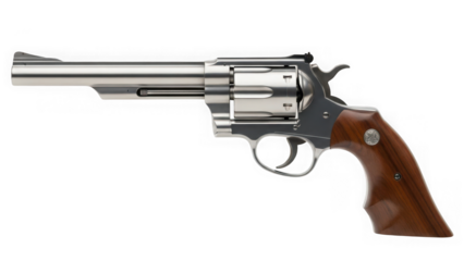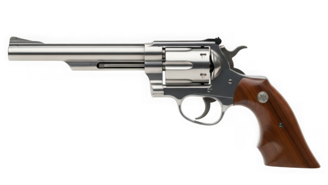 Hand holding a dark wood grip revolver aiming forward isolated on a transparent background handgun firearm
