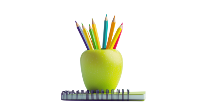 An apple on top of a spiral notebook, colored pencils, and a pencil in a canister, on a transparent backgrounds