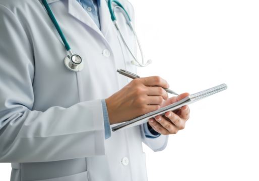 A doctor in a white lab coat writing on a clipboard isolated on transparent background