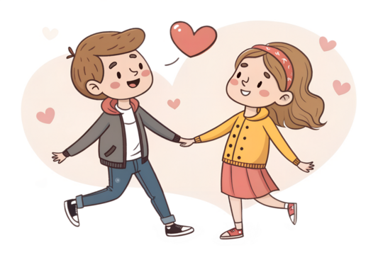 Loving couple holding hands and smiling, symbol of trust and romance. Cute Valentine’s Day cartoon illustration, isolated on transparent background.
