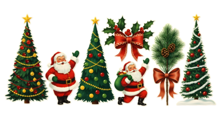 Collection of christmas trees and santa claus figures isolated on transparent background