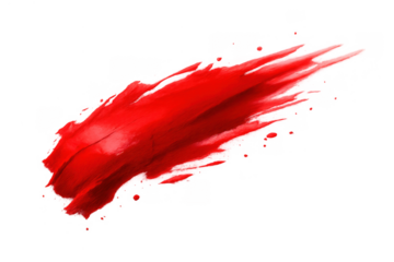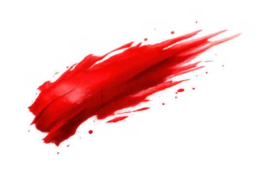 Red paint brush stroke creating an abstract smear, vibrant textured art element with splatters, isolated on transparent background