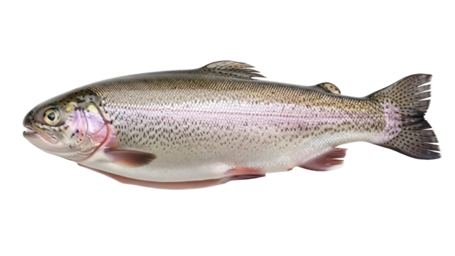 Rainbow trout isolated PNG on transparent background, freshwater fish with colorful iridescent scales for food and nature designs